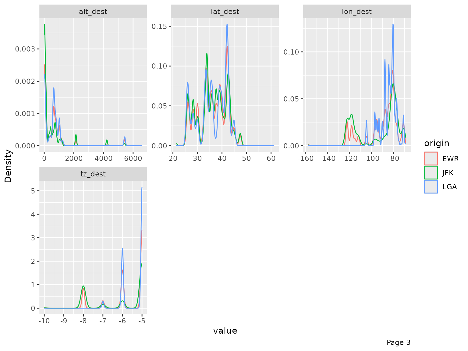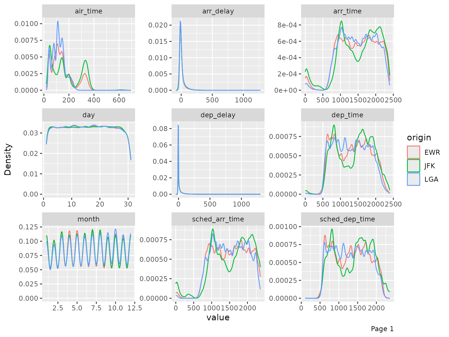 final_data <- drop_columns(final_data, c("year_flights", "tz_origin"))You may also view the histogram and the density estimates for all continuous features broken down by another feature (discrete or continuous).